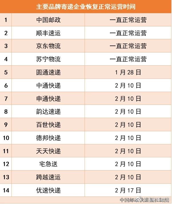 據(jù)國家郵政局消息,絕大部分主要品牌寄遞企業(yè)在2月10日恢復(fù)正常運(yùn)營(可能存在地區(qū)差異,運(yùn)營信息以當(dāng)?shù)匚锪髌髽I(yè)公告為準(zhǔn))。