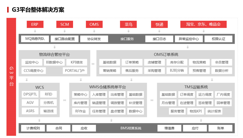 G3專注于平臺(tái)化物流體系搭建,以物流精細(xì)化管理的WMS為切入點(diǎn),結(jié)合OMS、TMS、BMS、WCS、LA+、BI、CCS、IDS、Portal、KPI等產(chǎn)品,通過統(tǒng)一的登錄、授權(quán)、管理平臺(tái),實(shí)現(xiàn)集團(tuán)信息一體化應(yīng)用部署。產(chǎn)品通過極簡UI風(fēng)格,高可靠性、高配置性、高靈活性和安全性,結(jié)合私有云、公有云、混合云部署模式與分布式服務(wù)器集群、接口標(biāo)準(zhǔn)化以及系統(tǒng)無感升級(jí)等特點(diǎn),可實(shí)現(xiàn)企業(yè)倉儲(chǔ)物流信息整合化、供應(yīng)鏈資源協(xié)同化、管理中臺(tái)數(shù)字透明化。